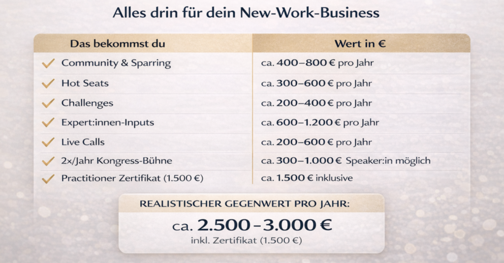 - Regelmäßige wöchentliche Live-Sessions New Work & Business Module (Wert: 600,00 €/Monat)